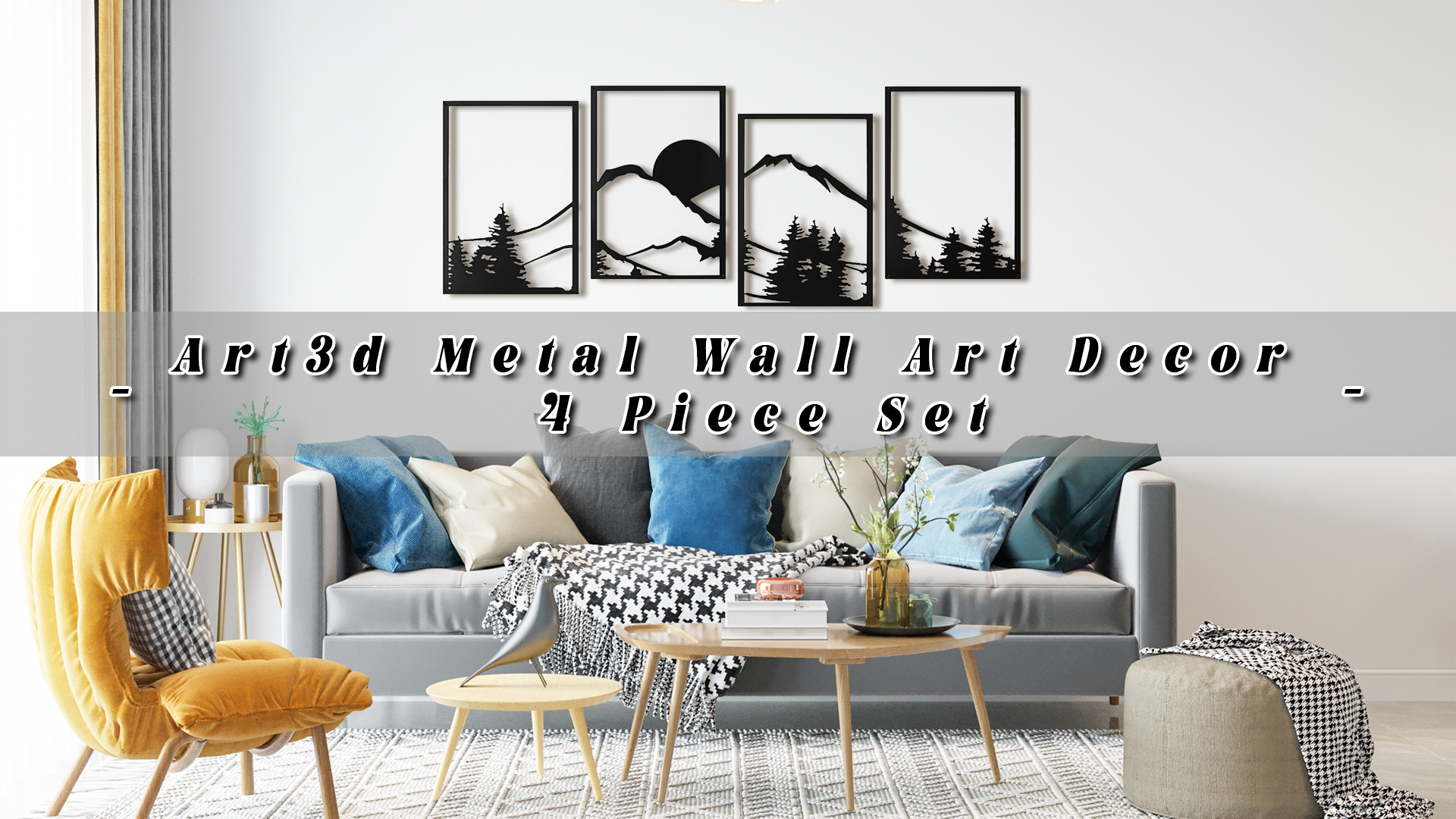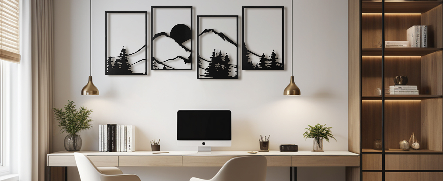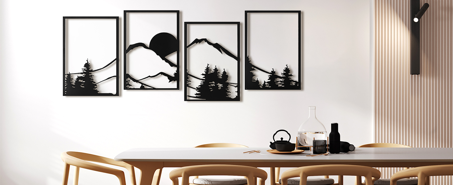 A22009BK04-Art3d Black Metal Wall art, 4 Pieces Wall Decor for Living Room Bedroom Hallway Hotel, Natural Mountain Pattern Wall Art Style, Line Art Wall Décor